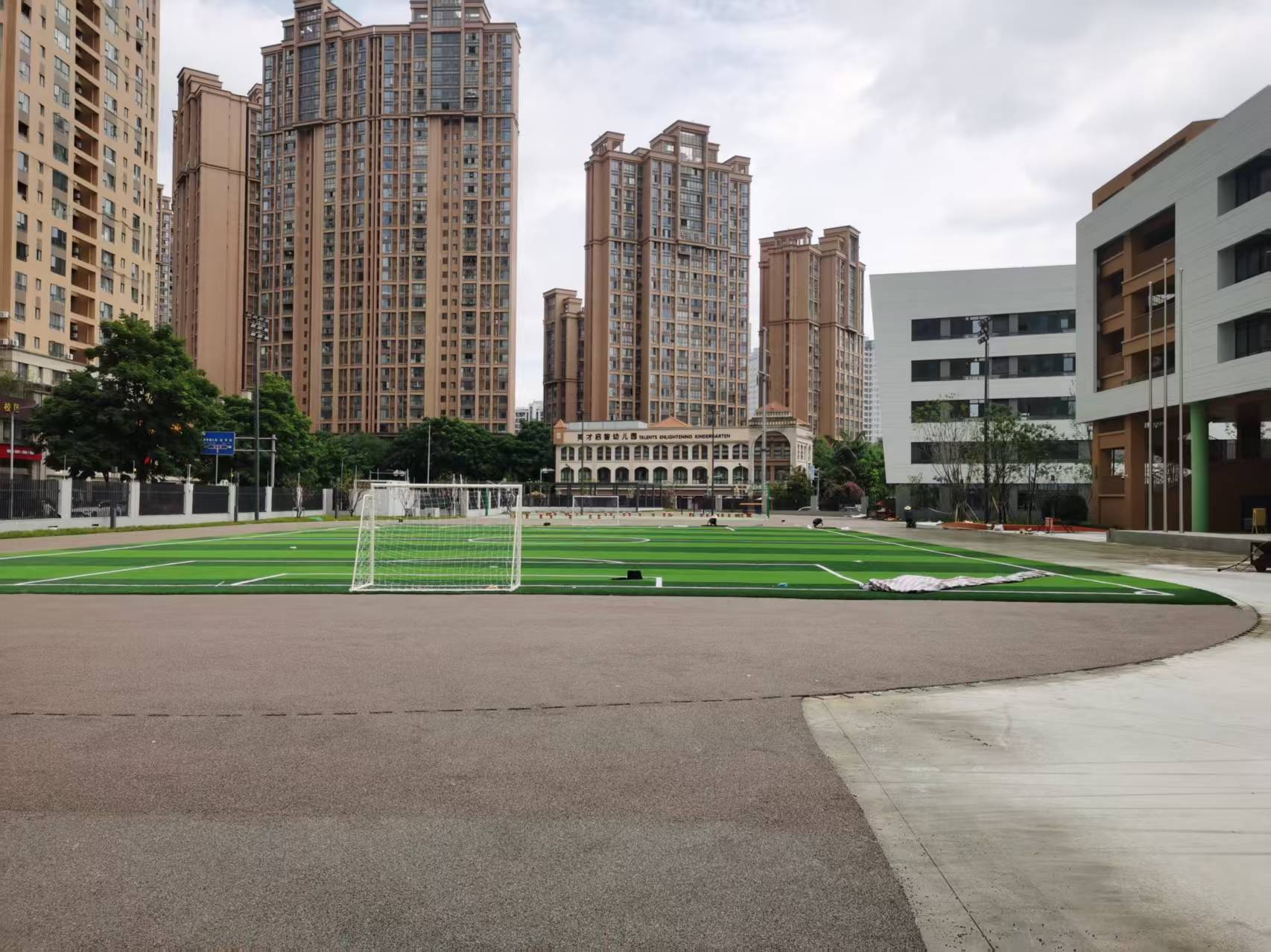 2025年6月25日橡树林小学运动场塑胶跑道弹性层施工中,体育器材安装完成