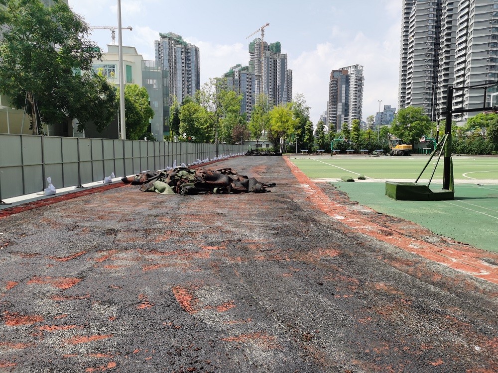 2025年7月9日麓湖小学塑胶跑道面层及篮球场面层铲除中
