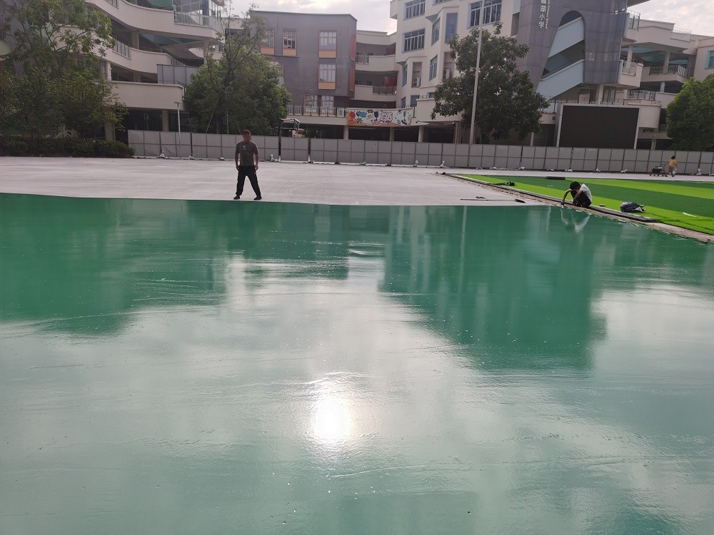 2025年8月14日天府新区麓湖小学运动场改造工程跑道弹性层施工中